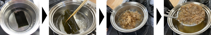 - 切り込みを入れた昆布を水と一緒に鍋に入れて、中火にかける。