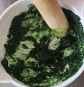 - 軸を除き、葉を広げ軽く刻み、すり鉢ですりつぶす。