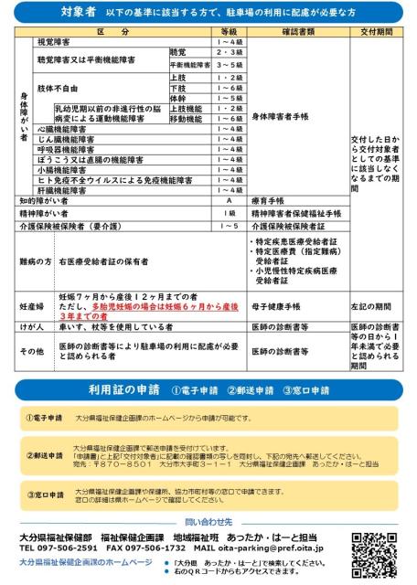 「大分あったか・はーと駐車場」とは、高齢の方や妊産婦の方など、駐車場の利用に配慮が必要な方々に対して、公共施設や店舗などの入口付近にある駐車スペースをご利用いただけるよう、県が共通の利用証を交付するものです。