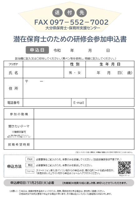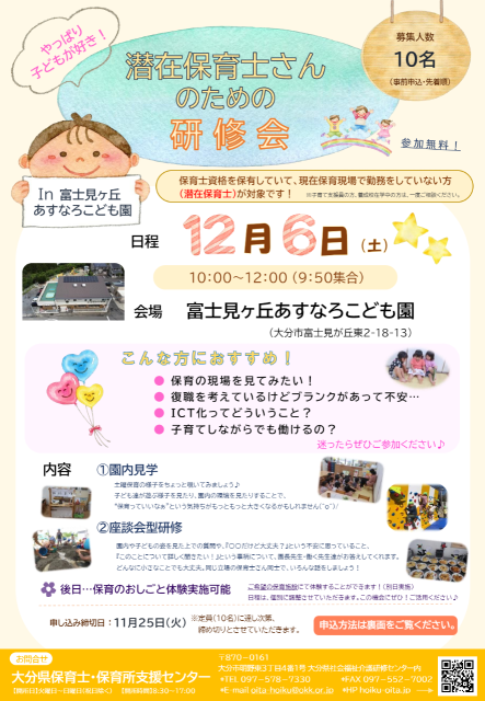 詳しくは、保育おおいたをご覧になるか、県保育士・保育所支援センターへお問合せください。