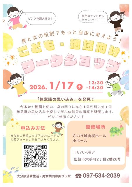 男女が共に働きやすい社会の実現に向け、女性活躍が進まない背景に存在している固定的な性別役割分担意識や無意識の思い込み(アンコンシャス・バイアス)を解消するため、地域の子どもや大人を対象にしてワークショップを開催します。